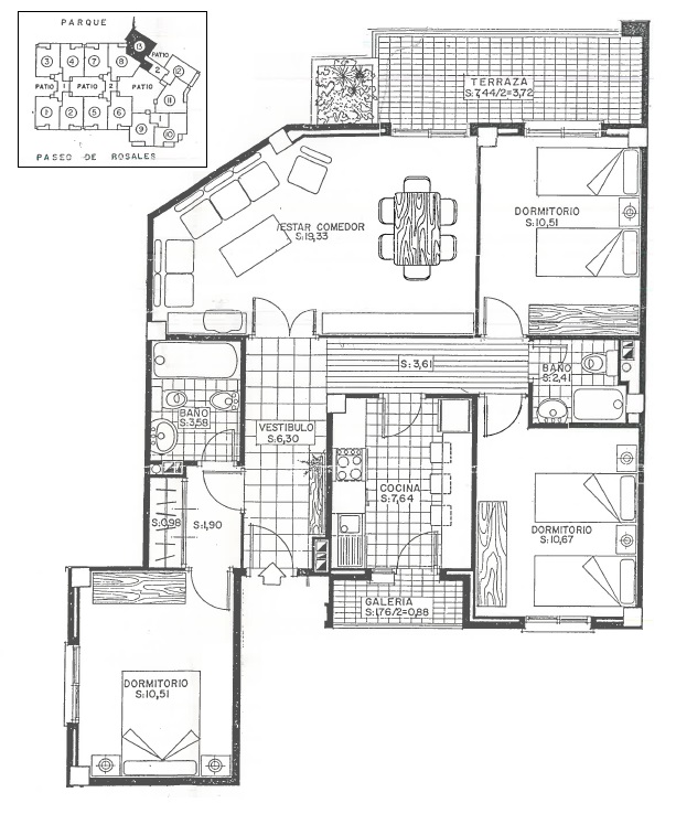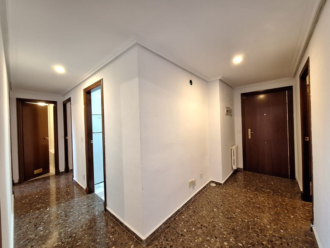 La vivienda es una séptima planta, luminosa, con salón y un dormitorio exterior con vistas al parque. Consta de 3 dormitorios, el principal de 13´40 m2 con armario empotrado y baño de 3´58 m2 dentro del dormitorio. Los otros dos dormitorios tienen una superficie de 10´51 m2 y 10´67 m2. El baño secundario tiene 2’41 m2. La cocina tiene acceso a una galería.