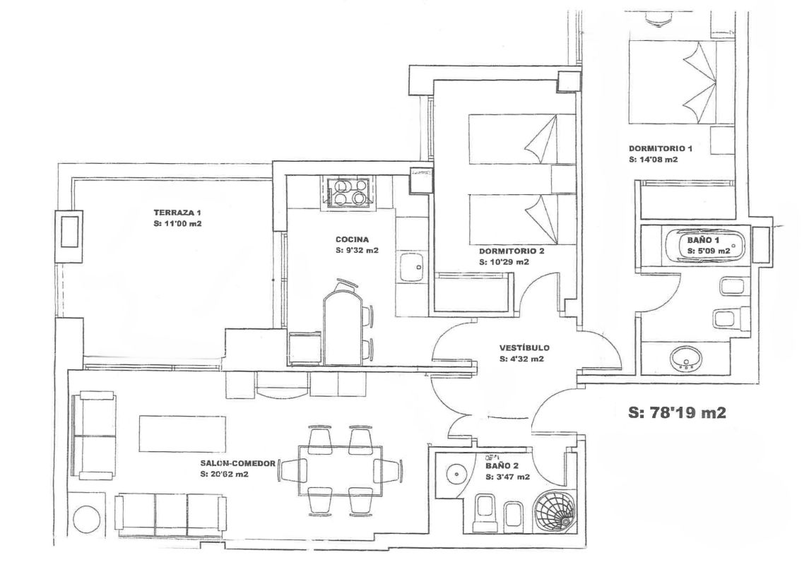 La vivienda tiene 78´19 m2 útiles incluida una magnífica terraza de 11 m2.  Con orientación al sur  y oeste, es toda exterior hacia la urbanización y a Vía Hispanidad.